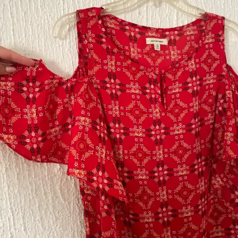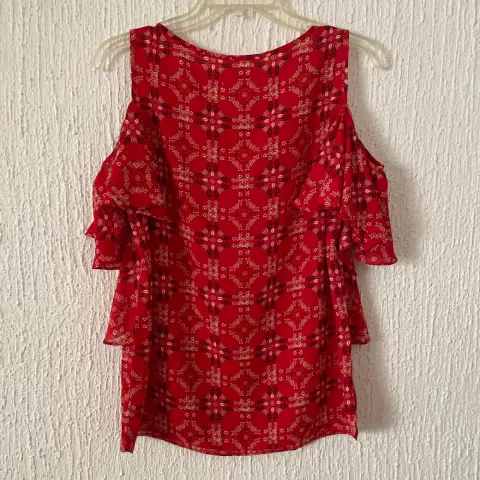 Blusa roja estampada nueva. Descripción:Blusa marca Max Studio.NUEVA sin etiqueta.Color rojo con estampado en colores negro, amarillo y blanco.Mangas de hombros descubiertos con volantes amplios.Tels súper cómoda y fresca.Talla chica.