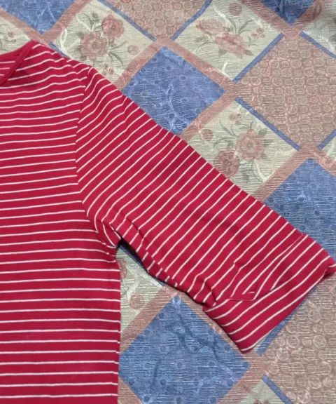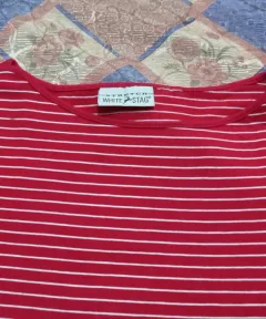 Blusa suave de tele strech algodón, manga 3/4, cuello tipo ojal. Color Rojo cereza con líneas blancas. Talla L, la tela estira un aprox. de 10 cm. Nuestros artículos se envían en cajas recicladas