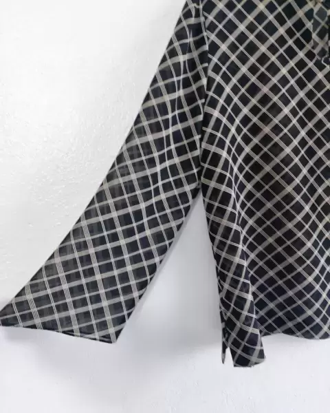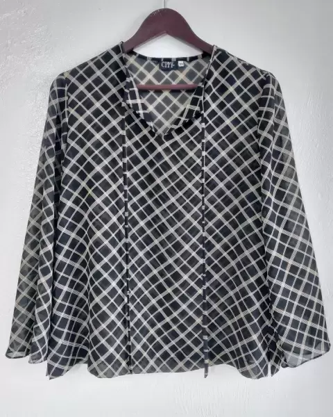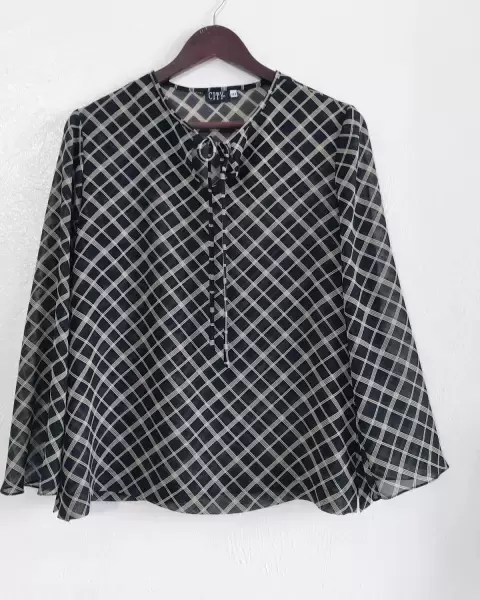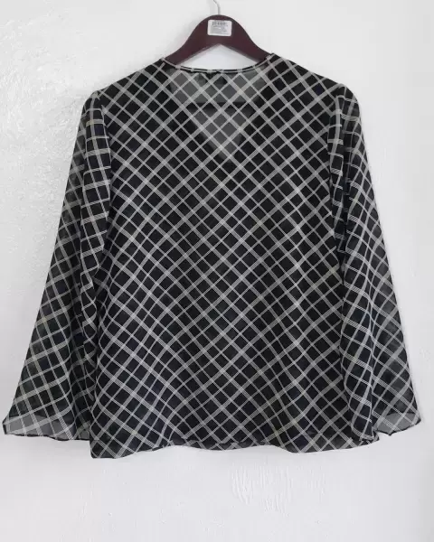 Blusa rombos elegante. Preciosa y elegante blusa en tela poliéster. Luce bella con bra negro porque si se transparenta, pero es elegante para lucir formal. Talla 34. No tiene strech.De axila a axila: 50 cmLargo: 60 cm
