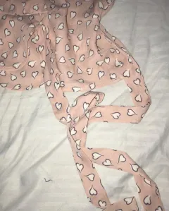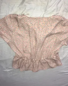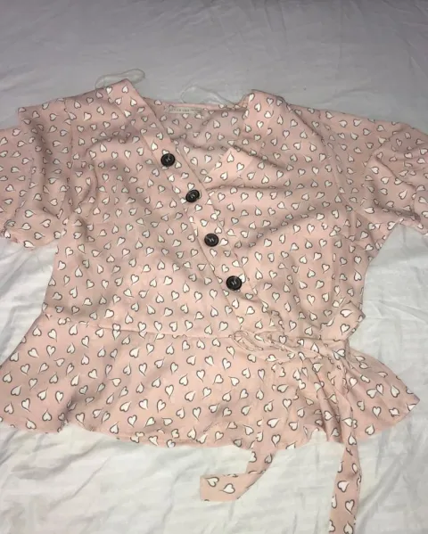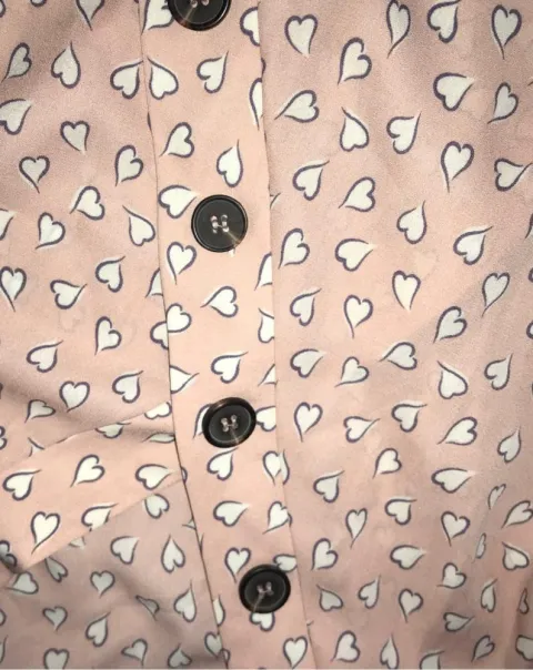 Blusa de color rosa con corazones blancos, cuello v, trae botones de adorno y un listón. Es Juvenil y fresca esta seminueva en perfecto estado talla L