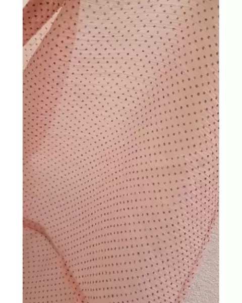 Blusa rosa con puntos negros transparente. Blusa de tela fresca, transparente., rosa con puntitos negros . Es talla S pero viene muy amplia . No tiene ningun detalle . La parte de atras es un poco mas larga que adelante