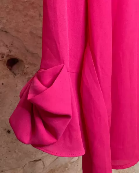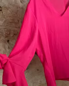 Blusa rosa de manga larga. Manga 3/4, con olanes en las mangas, talla 6