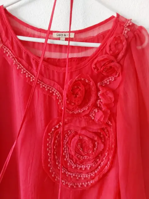 Blusa rosa fuerte con flores. Blusa suelta de gasa con fondo, manga 3/4 con elástico. Cuello redondo con aplicaciones con forma de flores y cinturón de la misma tela