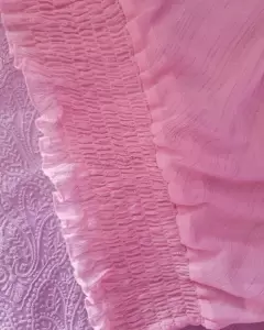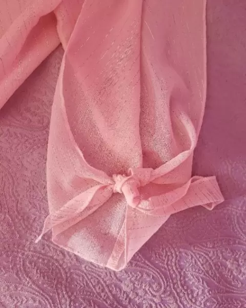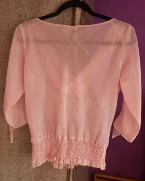 Blusa rosa LOB. En excelente estado, talla 2, manga descubierta, plisado en la parte de la cadera, los hilos plateados le dan un toque diferente igual que las mangas descubiertas, el escote en V no es tan pronunciado.