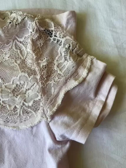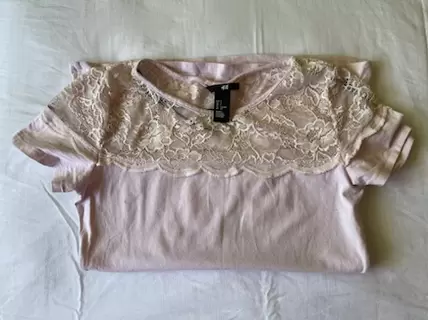 Blusa rosa pastel. Blusa rosa pastel con escote de encaje, tela stretch, talle largo, manga corta, talla S amplia.