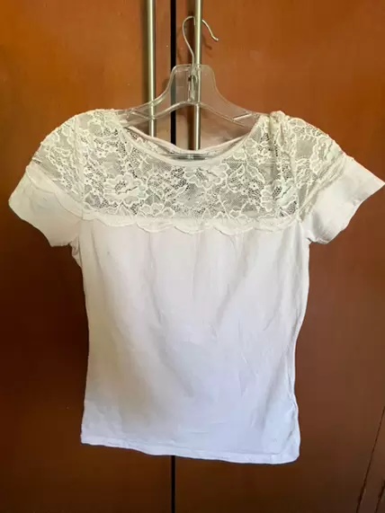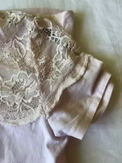Blusa rosa pastel con escote de encaje, tela stretch, talle largo, manga corta, talla S amplia.