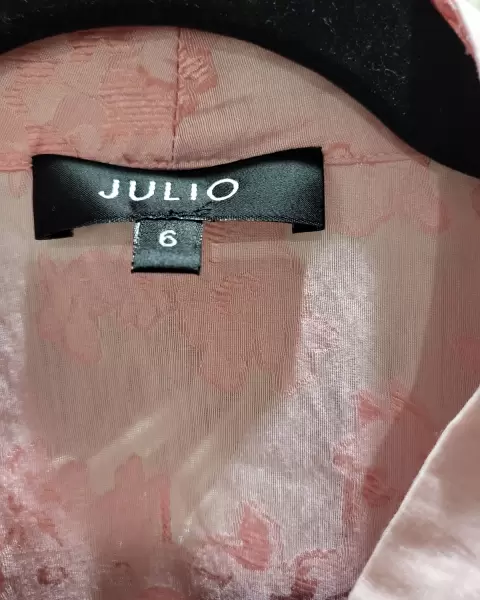 Blusa color rosa, con estampado rosa, sin mangas, le hace falta un boton, talla 6