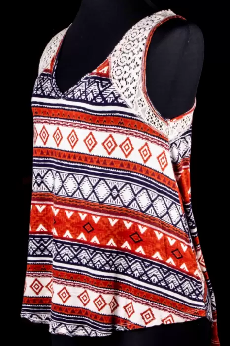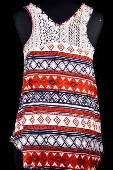 Blusa Rue21 estampado. Bonita blusa sin mangas, con detalle de encaje y estilo tribal marca Rue21. Es talla M, pero puede quedar a S, Mide 42 cm de axila a axila (estira) y 67 centímetros de largo (considerando la parte más larga que es la de la espalda).