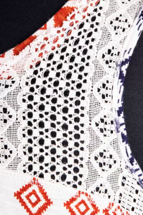 Bonita blusa sin mangas, con detalle de encaje y estilo tribal marca Rue21. Es talla M, pero puede quedar a S, Mide 42 cm de axila a axila (estira) y 67 centímetros de largo (considerando la parte más larga que es la de la espalda).