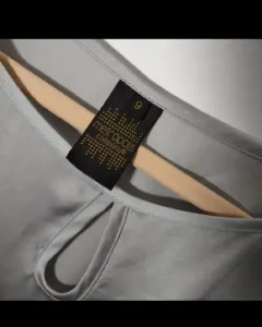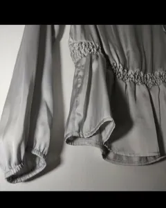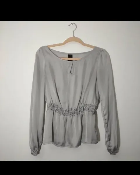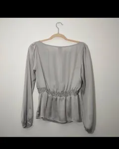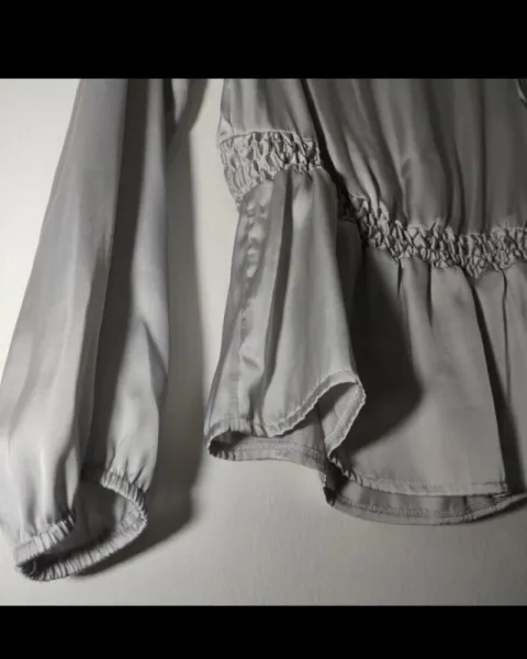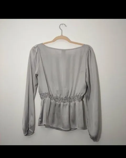 Blusa satinada gris plata. Glam!Blusa satinada gris plata con cintura alta ceñida con pretina decorada y mangas ceñidas bombachas, así como los hombros.T: MMedidas Axila 47cmLargo 56cm