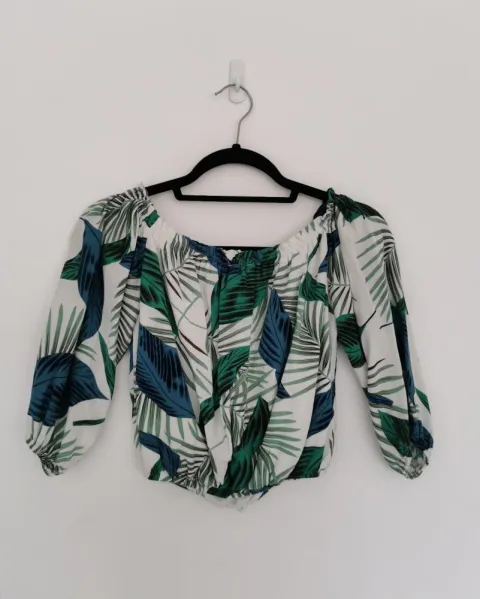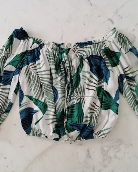 Blusa sin hombros. Color blanco con estampado de hojas. Mangas 3/4. Con elástico en el cuello, mangas y cintura. La blusa es a la cintura. Tiene cintas de adorno en el cuello. Talla M