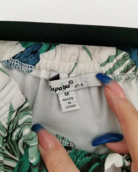 Blusa sin hombros estampada Papaya. Blusa sin hombros. Color blanco con estampado de hojas. Mangas 3/4. Con elástico en el cuello, mangas y cintura. La blusa es a la cintura. Tiene cintas de adorno en el cuello. Talla M
