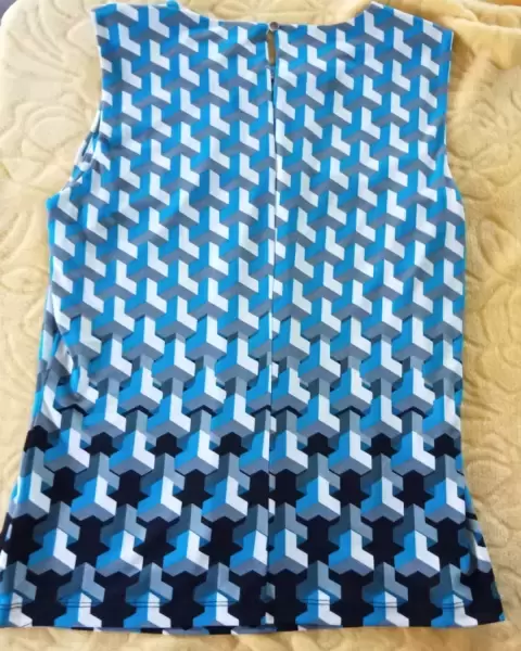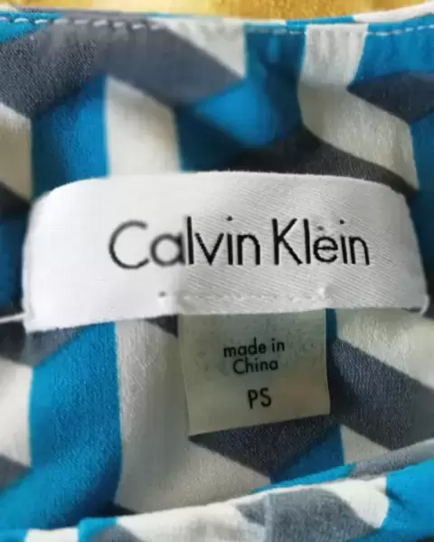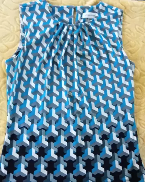 Blusa sin manga azul y negro Calvin Klein. Blusa cuello redondo , con pasteloncitos , tela licra,manga Corta, un botón en la parte de atras del cuello. Estampada azul,gris, blanco y negro.