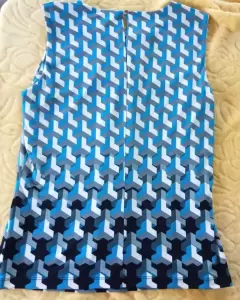 Blusa cuello redondo , con pasteloncitos , tela licra,manga Corta, un botón en la parte de atras del cuello. Estampada azul,gris, blanco y negro.