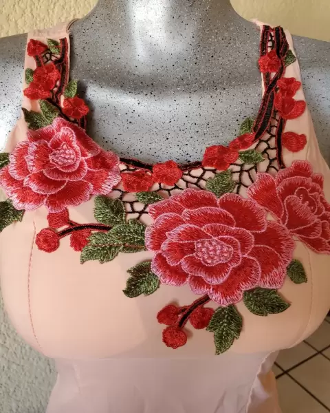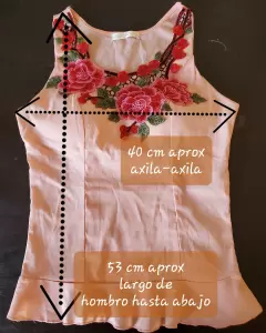 Blusa sin mangas. Blusa super fresca con aplicación de flores bordadas, trae copas integradas, forro solo en el area del busto y transparenta un poco.Color: Melón y en aplicacion de flores( rojo, rosita, verde y negro)Talla: por etiqueta L/XL pero viene reducida a XS - S.Tela: 65% algodón, 35% Polyester con ligero spandexDetalles: Ninguno