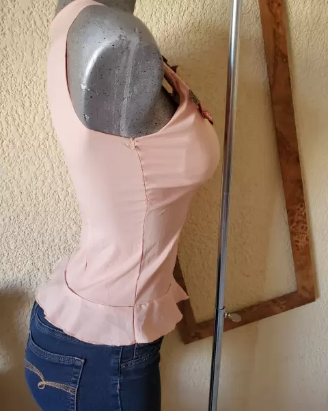 Blusa super fresca con aplicación de flores bordadas, trae copas integradas, forro solo en el area del busto y transparenta un poco.Color: Melón y en aplicacion de flores( rojo, rosita, verde y negro)Talla: por etiqueta L/XL pero viene reducida a XS - S.Tela: 65% algodón, 35% Polyester con ligero spandexDetalles: Ninguno