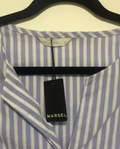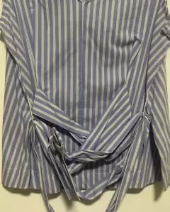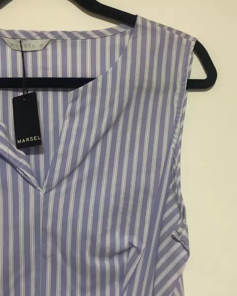 Blusa sin mangas de rayas. Blusa sin mangasDe rayas azules y blancasCon lazo en cinturaMarca MarselTalla 1068% algodón, 27% poliamida, 5% elastano