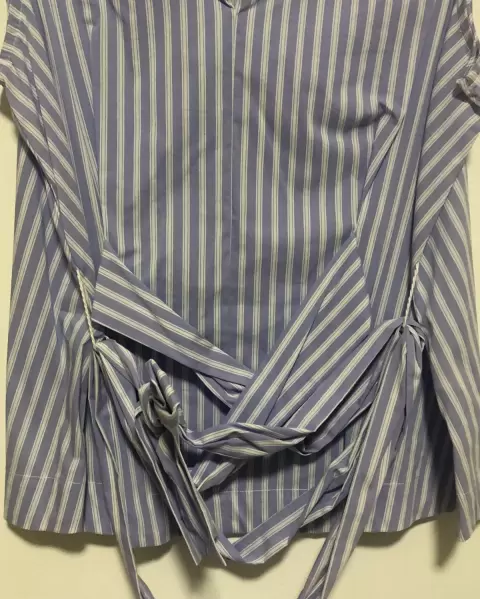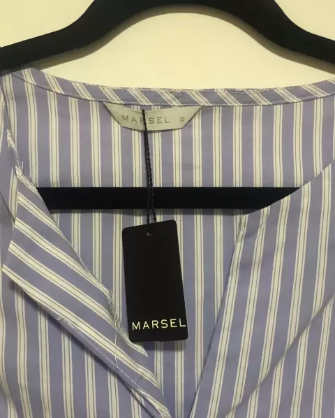 Blusa sin mangasDe rayas azules y blancasCon lazo en cinturaMarca MarselTalla 1068% algodón, 27% poliamida, 5% elastano