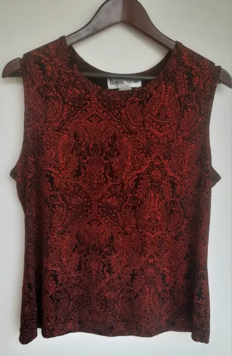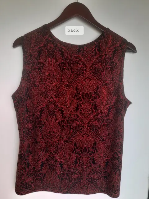 Blusa sin mangas metálica spandex. La convinacion entre rojo y negro metálico, le da mucha presencia a ésta linda prenda muy combinable con otras prendas. Sola, con saco, etc. Es super ajustable por sus materiales spandex y acetato. En perfectas condiciones. Honbros: 38 cmAxilas: 58 cmAlto: 55cmAncho brazo-axila 22cmNo te la pierdas!