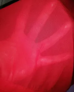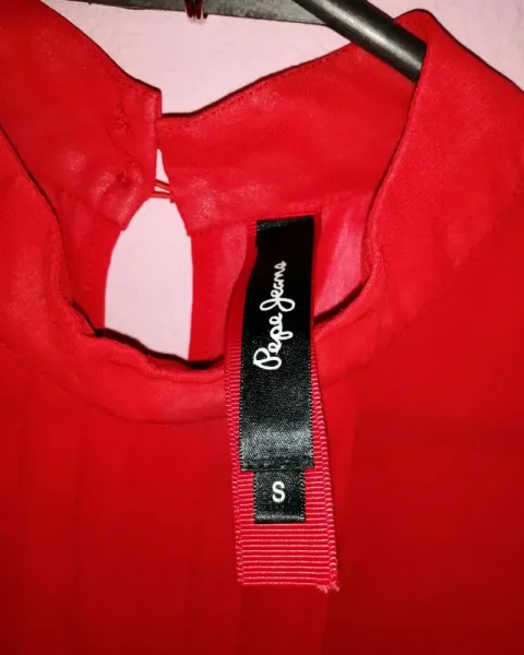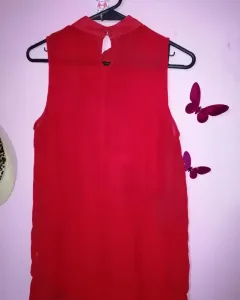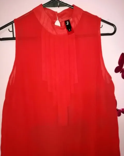 Hermosa blusa sin mangas y corbatín de la misma tela, es una tela transparente, color rojo, cuello alto. Se abrocha con dos botones al cuello son de la misma tela. Viene amplia le va bien a una talla M