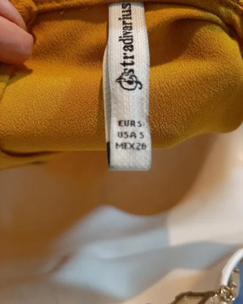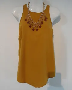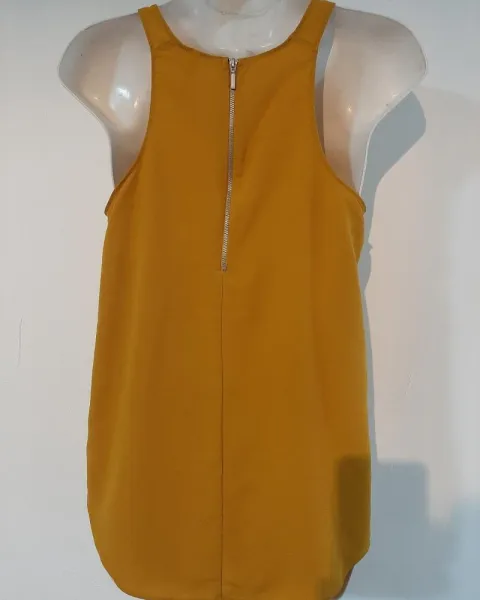 Blusa STRADIVARIUS mostaza. Blusa larga que llega abajo de la espalda, sin mangas, cuello redondo, con cierre en la parte atrás y color mostaza. Tela suave y no se transparenta. *el collar no va incluido pero en caso de que lo quieran aumenta el costo $50.