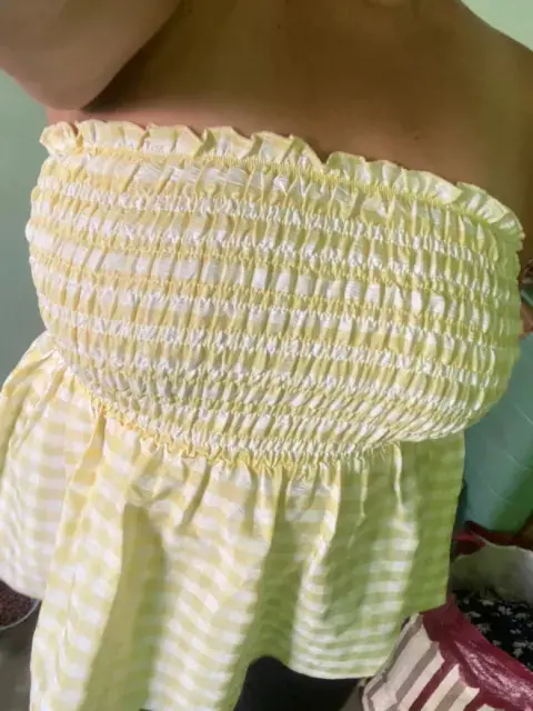 Blusa Strapless Curvy.. Bonita blusa es totalmente nueva, tiene resorte en el pecho, talla 1XL, es de cuadros amarillos con rojos y si encaja en la talla, solo que a mi no me va el estilo.
