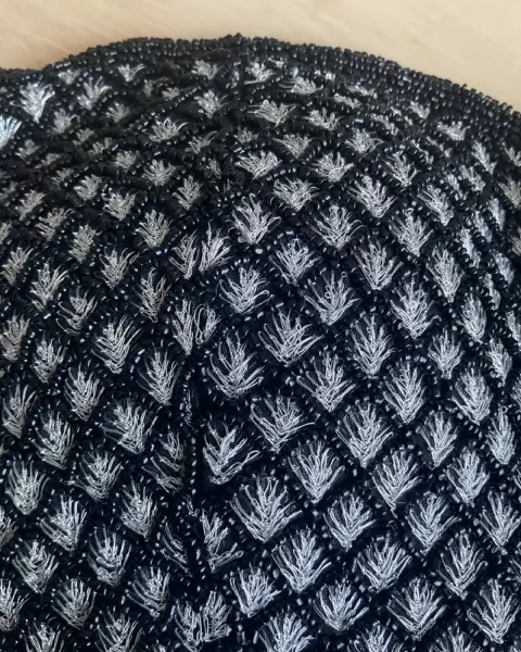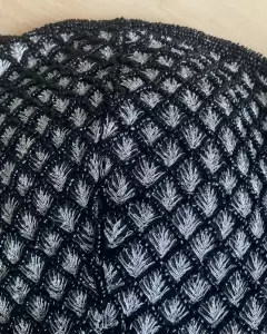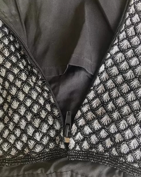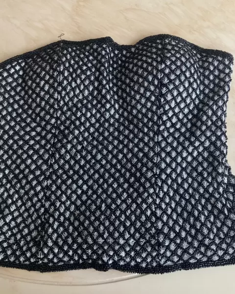 Negro, con hilos plateados, 100% seda, con bordado en chaquira, para fiesta, muy elegante, de axila a axila 40 largo 36 cm.