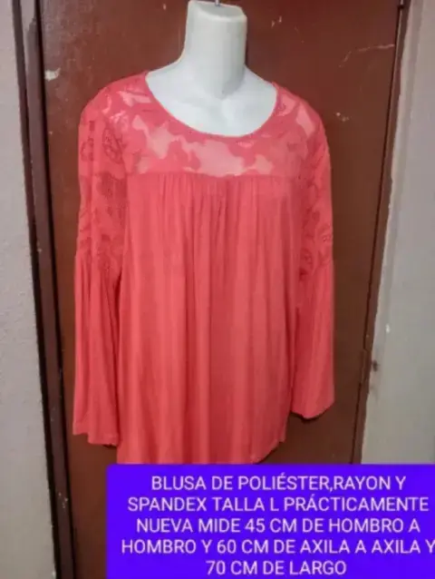 BLUSA DE POLIÉSTER,RAYON Y SPANDEX TALLA L PRÁCTICAMENTE NUEVA MIDE 45 CM DE HOMBRO A HOMBRO Y 60 CM DE AXILA A AXILA