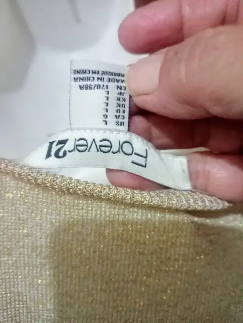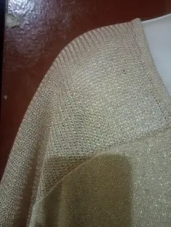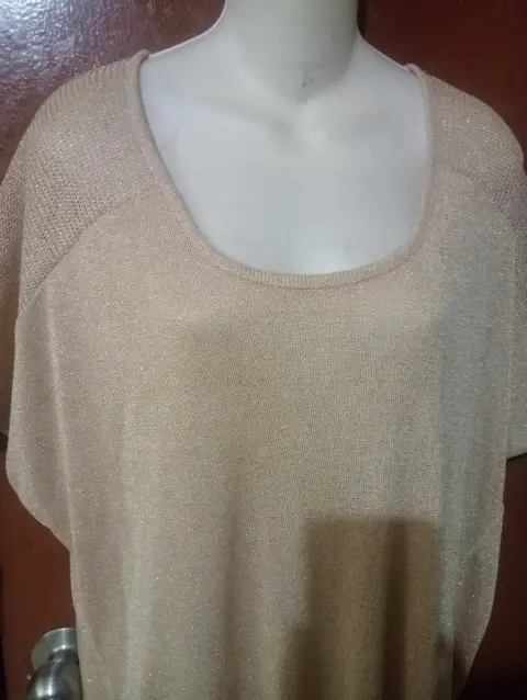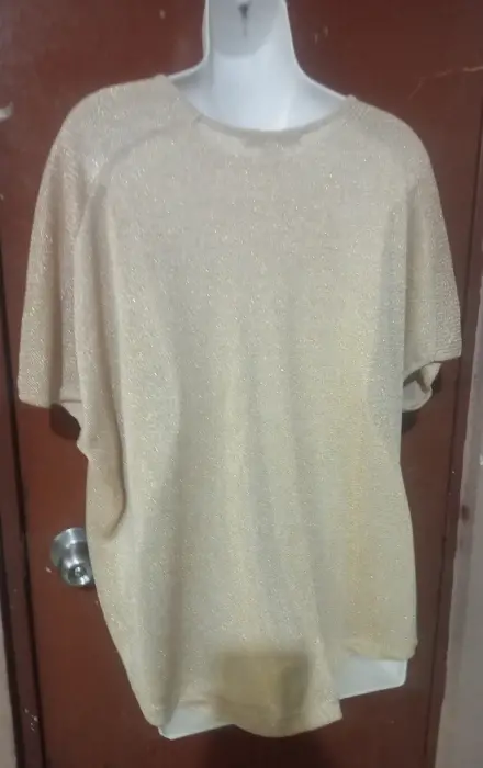 BLUSA DE POLIÉSTER, SPANDEX Y METÁLICO TALLA L PRÁCTICAMENTE NUEVA VIENE MUY AMPLIA QUEDA A XL TAMBIÉN LA PARTE DE ATRAS ES UN POCO MAS LARGA