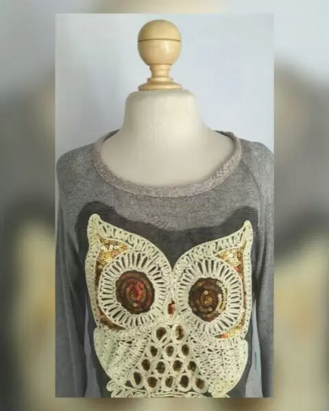 Blusa Tejido Punto c/Aplique Lentejuela. Blusa en tejido de punto bitono GRIS LONDRES JASPEADO/KHAKI, cuello redondo, manga larga y aplique búho en lentejuela e hilo trenzado. Talla G. Dimensiones cms: 44 hombro, 52 axila, 49 cintura, 50 zona baja, 55 largo, 58 largo manga. 57.5% poliéster, 42.5% viscosa. Para lavado en casa.