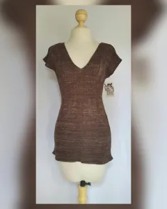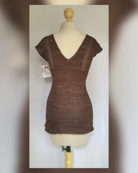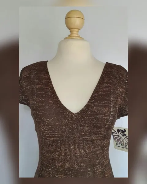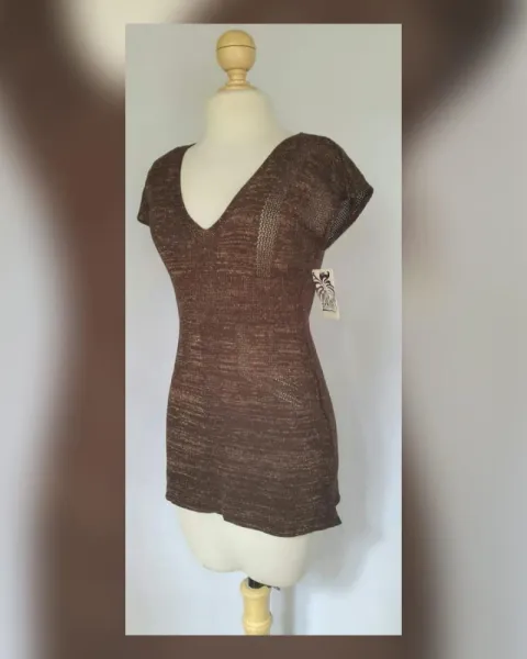Blusa en tejido de punto color CHOCOLATE c/hilo metalizado, cuello pico y manga sisa. Talla G (REDUCIDA, da mejor a M). Dimensiones cms: 49 hombro, 38 axila, 28 cintura, 54 zona baja, 70 largo. 78% acrílico, 18% fibra metalizada, 8% elastano. Para lavado en casa.***POR LA COMPOSICIÓN DE LA PRENDA, DA DE SI APROX 10 CMS***