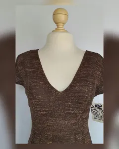 Blusa Tejido Punto efecto Metalizado Chocolate. Blusa en tejido de punto color CHOCOLATE c/hilo metalizado, cuello pico y manga sisa. Talla G (REDUCIDA, da mejor a M). Dimensiones cms: 49 hombro, 38 axila, 28 cintura, 54 zona baja, 70 largo. 78% acrílico, 18% fibra metalizada, 8% elastano. Para lavado en casa.***POR LA COMPOSICIÓN DE LA PRENDA, DA DE SI APROX 10 CMS***