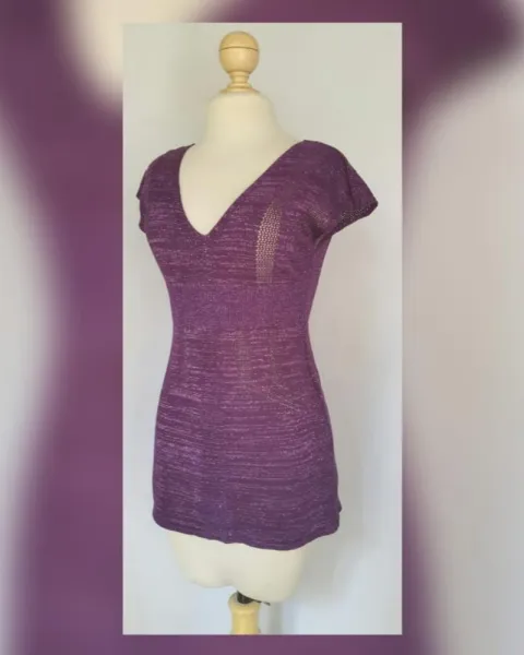 Blusa en tejido de punto color PURPURA c/hilo metalizado, cuello pico y manga sisa. Talla G (REDUCIDA, da mejor a M). Dimensiones cms: 45 hombro, 35 axila, 31 cintura, 52 zona baja, 70 largo. 78% acrílico, 18% fibra metalizada, 8% elastano. Para lavado en casa.***POR LA COMPOSICIÓN DE LA PRENDA, DA DE SI APROX 10 CMS***