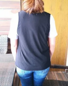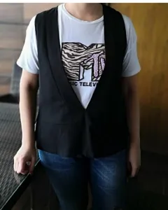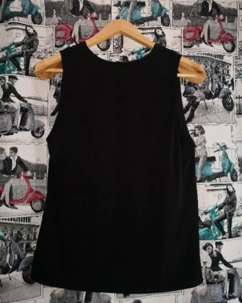 Blusa tipo blazer sin mangas. Blusa negra de tela vaporosa, ideal para usarla con una blusa blanca abajo. De hecho si venía el conjunto pero la blanca se rompió y x eso no tiene etiqueta.