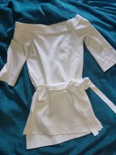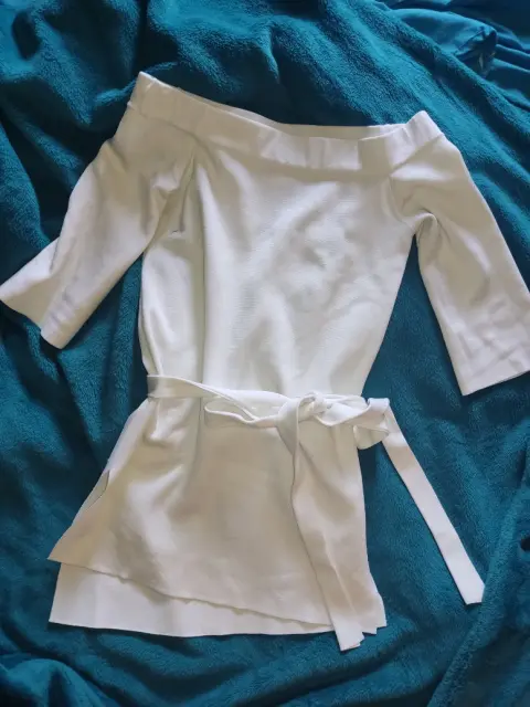 Hermosa blusa pegadita, tela gruesa tipo tejido cerrado, color crema casi blanco, es con hombros descubiertos y de largo tapa la pompa ya que de la parte de atrás está mas larga, a los lados tiene unas aberturas. Se ve excelente y eleganta.Envíos de lunes a sábado.