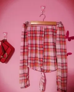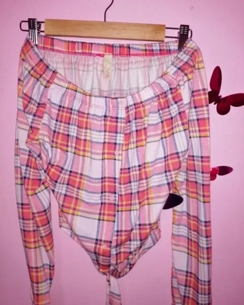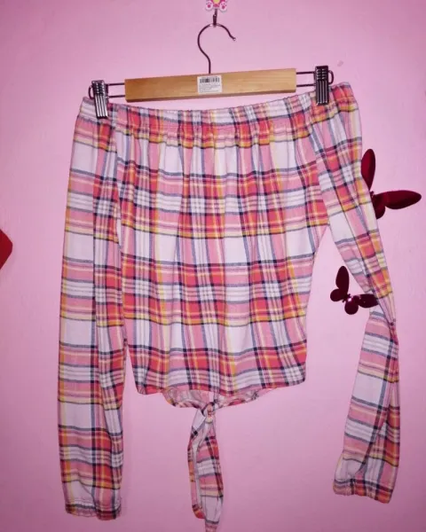 Hermosa blusa de Tela tipo franela super strech, manga larga, corte campesino, hombros descubiertos, tiene un coqueto nudo en la parte de enfrente. Predomina el color rosa