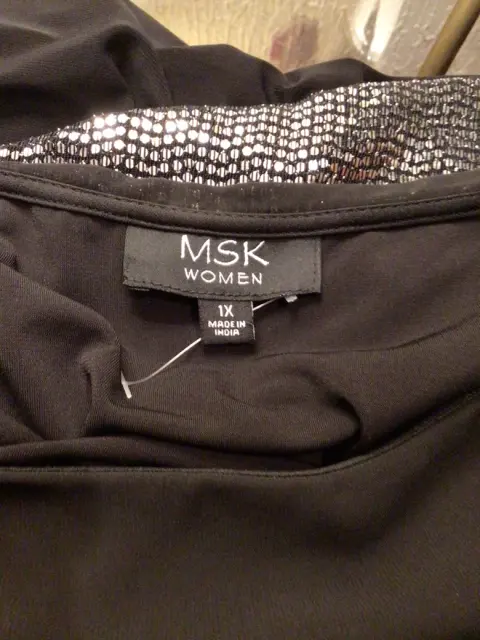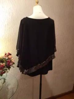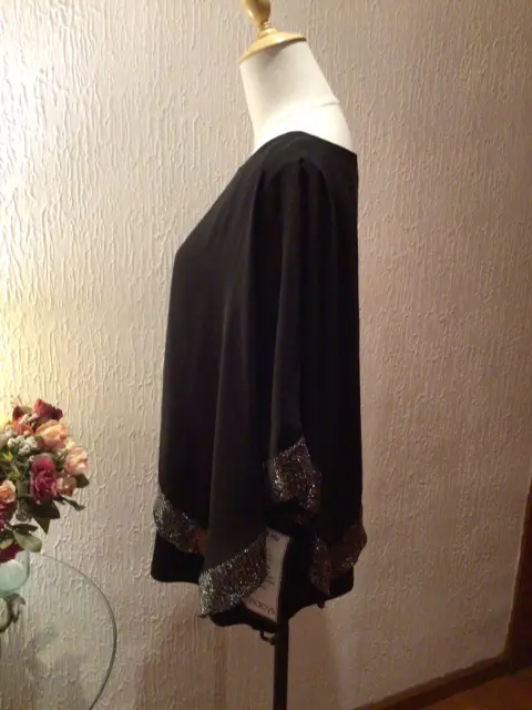 BLUSA TIPO CAPA ELEGANTE. BLUSA TIPO CAPA MARCA MSK WOMEN, COLOR NEGRO TALLA 1X, SIN MANGAS ASIMÉTRICA CON FRANJA DE BRILLOS PLATEADO, LIGERA, ELEGANTE TELA FINA, COMBINA