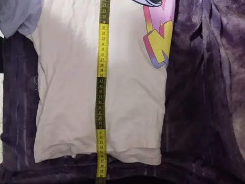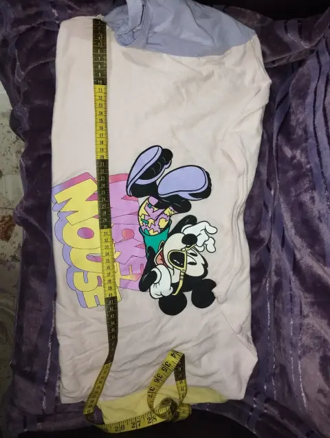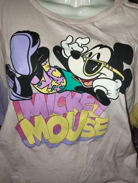 Bonita blusa tipo crop top de Mickey mouse, tela súper suavecita, de resca, mangas anchas, color amarillo y lila, estampado Mickey mouse súper colorido, marcado como talla M-G, medidas en la última imagenIdeal para un outfit moderno y colorido 🌈