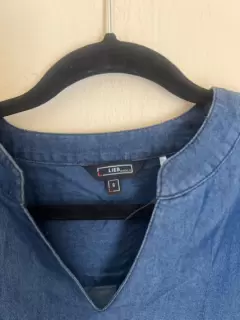 Blusa , tela tipo mezclilla, manga larga , cuello Mao en V , tela fresca y detalle en hombros tipo pinzas , talla L amplia , color azul mezclilla obscura