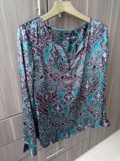 Hermosa blusa tipo seda en excelente estado, manga larga ideal para este verano, cuello v , super linda.