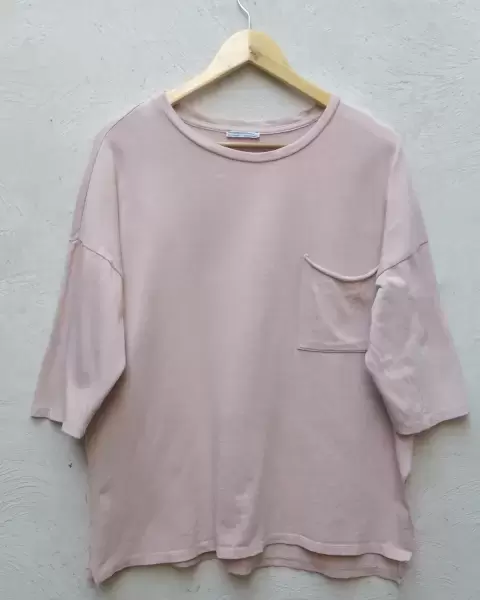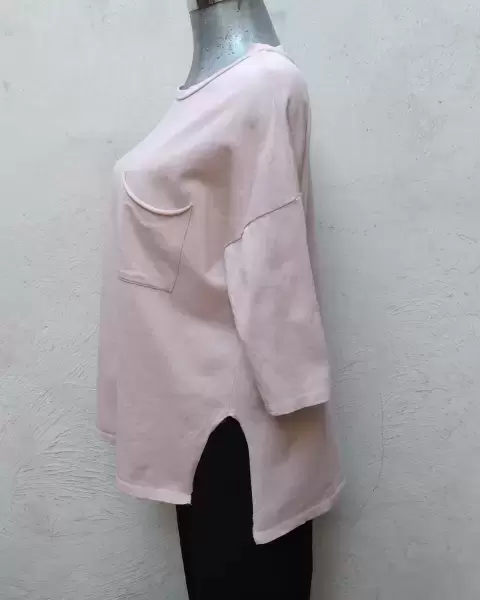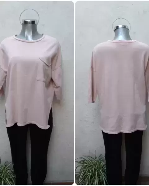 Comoda y basica blusa overzize tela como de sudadera color como salmon o rosa en talla S tambien queda a M con averturas laterales como unico detalle un poco descosido uno de los laterales manga 3/4 MEDIDAS ziza a ziza 62cm largo 65cm ligeramente mas larga atras