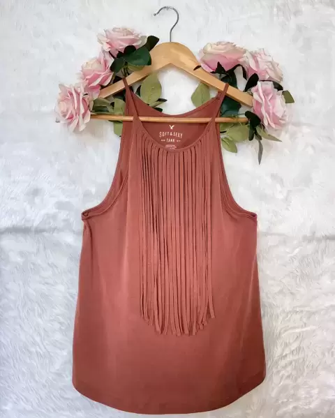 Blusa tirantes 🤎🧡 AMERICAN EAGLE 🦅. ✨𝗡𝗨𝗘𝗩𝐀✨ Hermosa blusa color marrón/naranja con flequillos, en perfecto estado! Super chic! Marca: ᴀᴍᴇʀɪᴄᴀɴ ᴇᴀɢʟᴇ ᴏᴜᴛꜰɪᴛᴛᴇʀs Talla S / CH Te va a encantaaaar! Dale a esta prenda un 𝟐𝐧𝐝𝐜𝐡𝐚𝐧𝐜𝐞! ✌🏼😉 Y 𝑟𝑒𝑐𝑢𝑒𝑟𝑑𝑎... “𝑃𝑜𝑛𝑡𝑒 𝑓𝑒𝑙𝑖𝑧!𝑝𝑜𝑟 𝑞𝑢𝑒 𝑔𝑢𝑎𝑝𝑎 𝑌𝐴 𝐸𝑆𝑇𝐴𝑆!“ 💅🏼