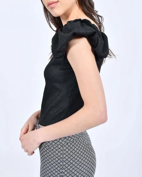 Blusa Top negra con brillos metálicos con hombros escarolados sin mangas, se ve súper linda y además combina perfecto con casi todo.