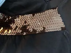 Detalle de lentejuelas doradas , color café Talla xS , escote redondo , con soporte interior en área del busto