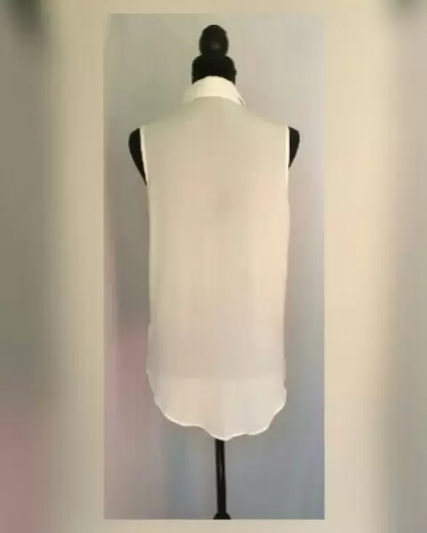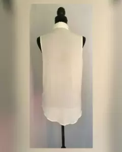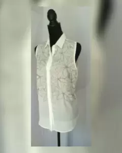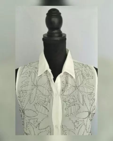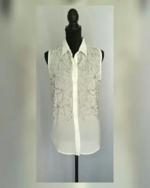 Blusa translúcido color IVORY (entre blanco y marfil) con bordado frontal de canutillo tono PLATA PATINADA, cuello clásico c/solapas, manga sisa y cierre p/botonadura frontal. Talla M. Dimensiones cms: 36.5 hombro, 50 axila, 53 zona baja, 67.5 largo frontal, 73 largo trasero. 100% poliéster. Para lavado en casa.**NUEVA, NUNCA SE HA USADO, SE LE CAYÓ LA ETIQUETA ESTANDO GUARDADA**