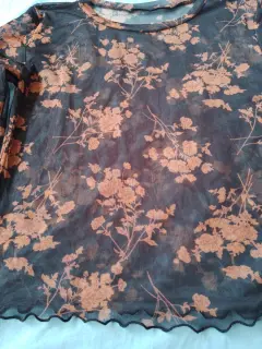 Blusa transparente con flores. La tela es suave, transparente, color negro con café, y tiene flores.De largo llega a la cintura.