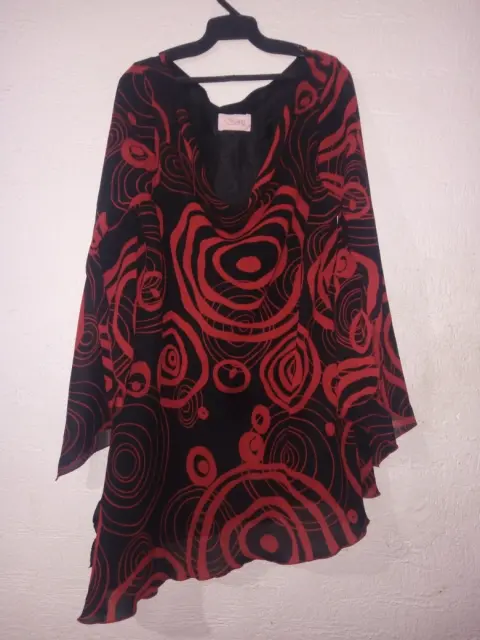 Blusa túnica manga 3/4 tela transparente con forro color negro, estampado en rojo y negro, el cuello tiene caída al frente y abertura en cada manga. Mide de axila a axila 124 cm y de largo 90 cm.