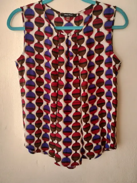 Blusa vaporosa sin mangas. Linda blusa vaporosa 100% poliéster sin manga y lindos pliegues en la parte de enfrente y atrás que realzan la figura.Diseño de círculos en colores cafe, vino y azul marino con fondo en blanco.Nueva sin etiqueta 🏷️Marca Nine West talla S mide 38 cm hombro,52 cm axila y 65 cm larga