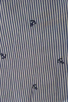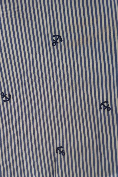 Blusa con hombros descubiertos, manga 3/4 y en tonos lineales blanco con azul.