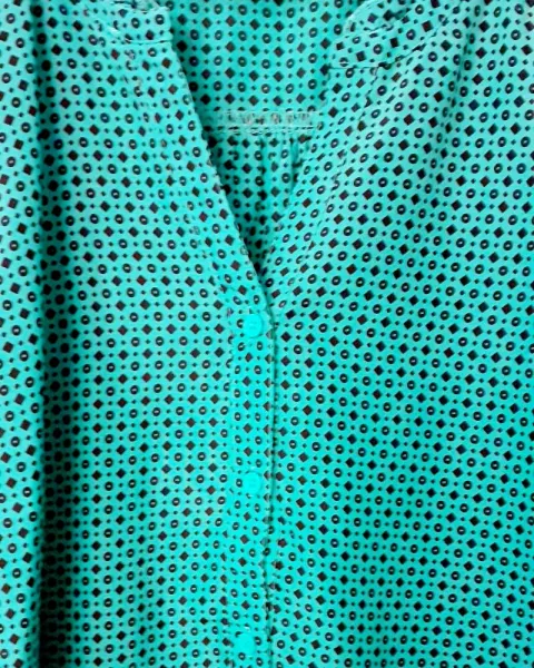 Blusa verde con textura en negro cuello en v, tres botones en escote, manga 3/4, tela que no se plancha.Talla xl pero es muy reducida, queda en talla de mediana a grande